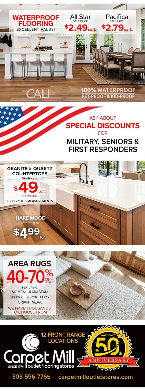 Lowest Prices Guaranteed • Satisfaction Guaranteed • Lifetime Carpet Installation Guaranteed • Free Estimates. All hardwood and laminate manufacturers recommend whole-house humidifiers in dry climates like Colorado to properly maintain your wood and laminate floors. make sure your system is working properly at all times to maintain your manufacture and installation warranties. All said warranties and guarantees are not applicable unless flooring purchase is paid in full. Annual professional cleaning required. See store for specific details regarding cleaning. 40% Off msrp. W.A.C minimum finance amount is $300. Excludes prior sales, factory direct super buys, clearance items, closeouts, pad, remnants, and hard surface flooring. Some restrictions may apply. CLOSED SUNDAYS ~ FAMILY DAY • SPECIAL DISCOUNTS FOR SENIORS AND MILITARY.