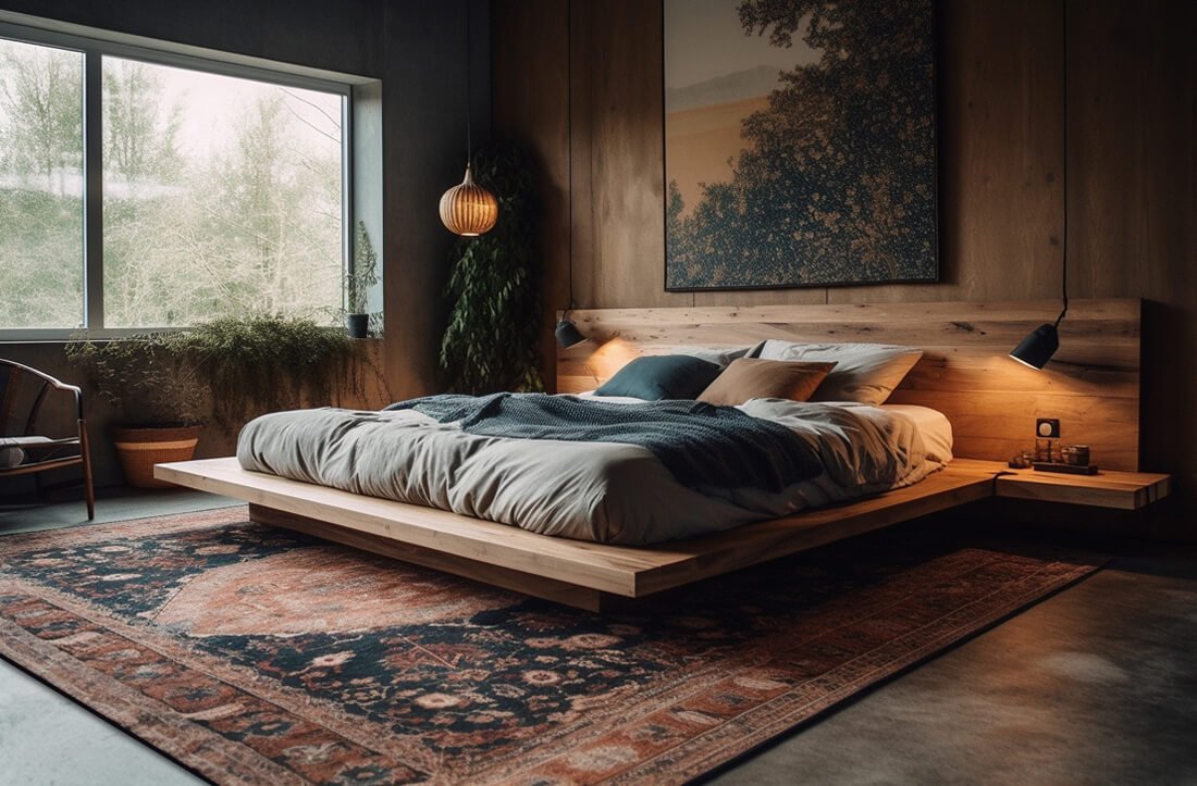 Make the bed the center of attention in the bedroom by using an area rug. Choose a rug that extends 2 feet past the boundaries of the bed on all sides if your bed is not flush with a wall.