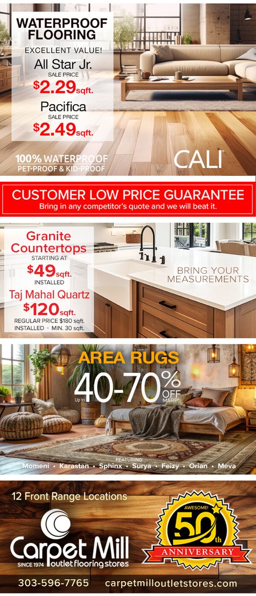 Lowest Prices Guaranteed • Satisfaction Guaranteed • Lifetime Carpet Installation Guaranteed • Free Estimates. All hardwood and laminate manufacturers recommend whole-house humidifiers in dry climates like Colorado to properly maintain your wood and laminate floors. make sure your system is working properly at all times to maintain your manufacture and installation warranties. All said warranties and guarantees are not applicable unless flooring purchase is paid in full. Annual professional cleaning required. See store for specific details regarding cleaning. 40% Off msrp. W.A.C minimum finance amount is $300. Excludes prior sales, factory direct super buys, clearance items, closeouts, pad, remnants, and hard surface flooring. Some restrictions may apply. CLOSED SUNDAYS ~ FAMILY DAY • SPECIAL DISCOUNTS FOR SENIORS AND MILITARY.